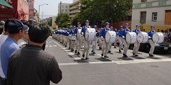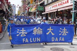 Le 13 juillet, la température à San Francisco était très agréable. La Fanfare de la Terre divine de l’ouest des Etats-Unis avec plus de 100 membres, tous des pratiquants de Falun Gong, est venue montrer son soutien. À midi, le défilé avec la musique et les roulements puissants des tambours a traversé le centre commercial animé de San Francisco pour aller à Chinatown et jusqu'à sa destination finale, Portsmouth Square. Les élèves de l'école Minghui ont chanté et ont dansé sur la place et ont attiré les passants.