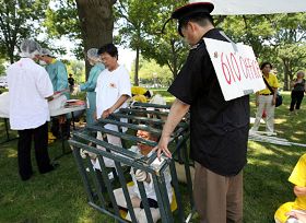 Xu Zhichao sourit aux gens sur l'Avenue Constitution à Wahington, D.C. en distribuant des dépliants de clarification de la vérité. Il parle aux gens tout en marchant avec eux, parfois même en courant avec eux. Beaucoup de gens ralentissent en écoutant Xu et posent des questions, attirés par le rassemblement anti-persécution à grande échelle tenu par les pratiquants de Falun Gong dans le Parc 'Upper Senate'.