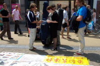 Pendant l'été, la ville attire de nombreux touristes, venant en particulier d'Allemagne. Une raison suffisante pour les pratiquants hollandais d'y tenir une journée d'information et de clarifier les faits sur ce qui est arrivé aux pratiquants de Falun Gong en Chine ces neuf dernières années. Il y avait beaucoup de monde par cette journée estivale ensoleillée et les gens qui passaient ont pris connaissance des messages sur les banderoles et de l'information exposée. Beaucoup de gens ont été touchés, beaucoup de jeunes personnes et d'enfants se sont arrêtés et ont posé des questions à propos des exercices du Falun Gong, les violations des droits de l'homme en Chine et ont aussi voulu signer la pétition. Un membre d'Amnesty International a dit qu'il savait déjà tout à propos de la réalité brutale du Parti communiste chinois (PCC) Il a exprimé son admiration pour les pratiquants et leurs efforts répétés pour aider pratiquants de Falun Gong persécutés en Chine. Il est resté longtemps à discuter, a signé la pétition et dit en partant "Vous êtes une communauté forte, bonne chance !"