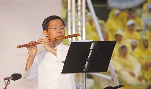 Le pratiquant Hong Guoqin joue de la flûte chinoise depuis plus de 10 ans et il espérait que sa flûte puisse aider à propager le message des principes du Falun Gong de l'Authenticité, la Bienveillance et la Patience.