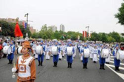 La fanfare de la Terre divine, composée de plus de 100 pratiquants de Falun Gong, a joué deux fois dans ce défilé. Cette année, ils portaient le nouveau costume traditionnel chinois de la dynastie Song, lequel est bleu et blanc. Les couleurs brillantes et leur excellente prestation a attiré de nombreux spectateurs.