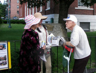 Vers la fin du mois de juin, un vieil homme est allé au "Centre de Service des démissions du PCC" sur Main Street alors que les complices engagés par le PCC essayaient encore de créer des troubles à quelques mètres de là. Avec une main posée sur sa béquille, il a utilisé son autre main pour tendre une canette de thé glacé qu'il a offert aux pratiquants du Falun Gong. Il a dit : "Il fait si chaud. Ca c'est vraiment du bon thé. C'est pour vous. S'il vous plait prenez le. Je vous souhaite bonne chance! Je soutiens le Falun Gong!"