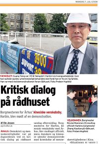 Des gens qui préparaient le rassemblement devant le gouvernement municipal ont attiré l’attention du Maire, M. Nicolai Wammen, qui attendait l’arrivée des fonctionnaires chinois. Il est sorti de son bureau et est venu parler aux manifestants. Après avoir compris que c’était un rassemblement pour les droits de l’homme, il a immédiatement indiqué son soutien et dit qu’ils fixeraient une autre rencontre avec les manifestants le plus tôt possible afin de bien comprendre la persécution à Harbin et en Chine. Lorsqu’il a accepté une interview avec la IIème chaîne de télévision danoise par la suite, M. Wammen a dit au journaliste que lors de sa rencontre avec le maire de Harbin, il avait demandé qu’Harbin améliore la situation des droits de l’homme et de la démocratie.