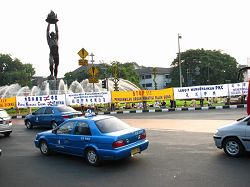 À 16h00 le 19 juillet 2008, les pratiquants de Jakarta se sont rassemblés dans un jardin. Ils ont tenu des banderoles face à une rue animée où les véhicules passent continuellement. Les messages sur les banderoles comprenaient « S’opposer paisiblement et rationnellement à la persécution », « Le Parti communiste chinois n’est pas la Chine » « Désintégrer le PCC et mettre fin à la persécution. » Les messages exprimaient la détermination des pratiquants à mettre fin à la persécution et ont aussi attiré l’attention des passants.