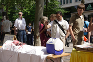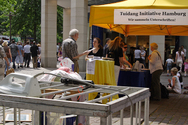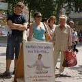 Un stand a été mis en place avec un pavillon jaune et une banderole "Falun Gong", largement visible tout autour, dans la rue des Moines de la montagne à Hambourg. Il y avait aussi une simulation des prélèvements d'organes qui a éveillé l'intérêt des passants. Des affiches montraient un homme dont le visage était tordu de douleur. On pouvait voir que sa poitrine avait été ouverte puis suturée Sous la photo quelques lignes expliquaient comment des prélèvements d'organes étaient perpétrés à grande échelle sous l'autorité du Parti communiste chinois (PCC). Les gens passaient, s'arrêtaient, lisaient l'information, puis approchaient et signaient la pétition demandant la fin des atrocités en Chine.