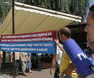 On peut lire sur l'affiche "Les Olympiques et les crimes contre l'humanité ne peuvent pas coexister en Chine,". Photo Nadya Kotseva (Sofia Photo Agency) |