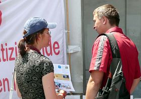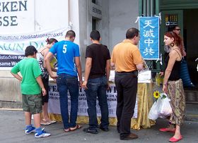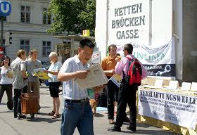 Naschmarkt est également connu pour son marché alimentaire. Les week ends, de nombreux habitants de Vienne y vont faire leurs courses. En passant près de la table d'information du Falun Gong, beaucoup de gens s'arrêtent pour s'informer à propos du Falun Gong et de la persécution.