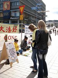 Pendant l'activité, il y a eu du tonnerre intermittent, et des nuages sombres ont couvert le ciel clair suivis d'une courte averse. Une vieille dame finlandaise a dit aux pratiquants, « Vous venez ici pour commémorer ces pratiquants de Falun Gong qui ont été torturés à mort. Le tonnerre et la pluie semblent démontrer que le Ciel partage votre tristesse. »