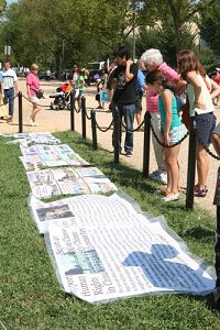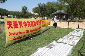 C'était une chaude journée de 91°F. Trois banderoles jaunes exceptionnelles devant le Musée national de l’aviation et de l’espace (National Air and Space Museum) ont attiré l’attention des touristes. « Falun Dafa est bon » ; « Authenticité, Bienveillance, Patience », et « Le PCC est condamné. Quittez le PCC pour être en sécurité » étaient écrits sur les banderoles en chinois et en anglais. Plusieurs affiches exposant la persécution étaient étalées sur l'herbe. Un flot constant de touristes a regardé les affiches et reçu des dépliants. Les bénévoles du Bureau pour démissionner du PCC ont distribué les Neuf commentaires sur le parti communiste et d'autres documents aux touristes.