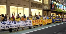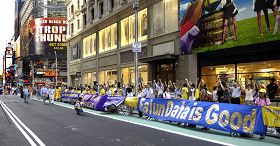 À la suite de la manifestation de mercredi dernier devant le consulat chinois protestant contre l'intensification de la persécution sous prétexte des Jeux Olympiques, les pratiquants de Falun Gong se sont rassemblés à Times Square, New York, le soir du 8 août 2008. Manifestant pacifiquement ils ont dénoncé la persécution violente des pratiquants de Falun Gong et appelé les New-Yorkais à prêter attention aux atrocités ayant cours en Chine.