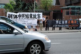 Les pratiquants de Falun Gong de Calgary protestent contre la persécution par le PCC devant le consulat chinois.