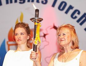 L’ambassadrice du relais de la flamme des droits de l’homme, Mme Jan Becker (à droite) et “la déesse de la justice » tiennent la flamme des droits de l’homme |