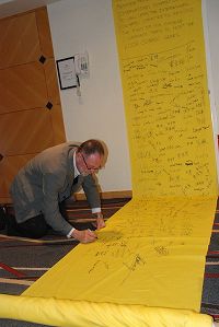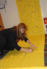 La porte-parole d’Amnesty International, Mme Margaret Taylor signe la bannière pétition pour soutenir Falun Gong |