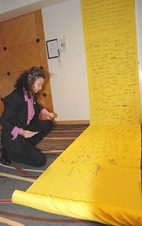 Le membre du Conseil de l’agglomération d’Auckland, le Dr Cathy Casey signe la bannière pétition pour soutenir Falun Gong |