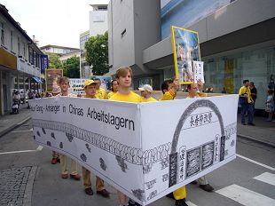 Stuttgart—Une allemande d’âge moyen a regardé longtemps la scène d’une femme chinoise menottée avec une chaîne d'acier aux poignets, dans une cage ne permettant pas de se tenir debout, et ses vêtements tâchés de sang. Un policier chinois tenait une matraque levée comme prêt à la battre. C’était une simulation de la torture réservée aux pratiquants de Falun Gong dans les camps de travail chinois. La femme a détourné la tête des larmes dans les yeux et a dit "C’est trop horrible !"