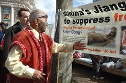 Le Chef Maori M. Amato Akarana est venu à Auckland exprimer son soutien. Il a fait un discours en Maori et en Anglais : "Les pratiquants de Falun Gong souffrent de la persécution. Ceux qui ne les soutiennent pas n'ont pas d'humanité. Je soutiens tous les pratiquants sur cette terre. Ils ont le soutien de tous les Maoris sur cette terre. Je jure au nom de ma vie, de mon village, et de ma famille que je soutiens les activités des pratiquants de Falun Gong contre la persécution."