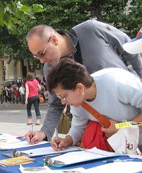 Un couple italien signe la pétition contre la persécution du Falun Gong. |
