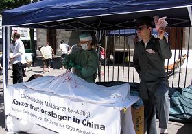 Simulation dénonçant les prélèvements d'organes à vif sur des pratiquants de Falun Gong pour le profit |
