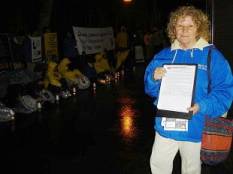 La pratiquante australienne Mme Colleen May a dit : « Aujourd’hui c’est une journée très spéciale. Cela fait 9 ans que la persécution envers le Falun Gong a commencé en Chine. »