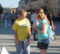 Le 20 juillet 2008, les pratiquants de Falun Gong polonais ont tenu diverses activités afin de clarifier les faits. Certains sont allés au marché et dans les restaurants chinois distribuant des matériaux de clarification des faits ; certains sont allés s’asseoir devant le Consulat chinois pour protester pacifiquement contre les neuf ans de persécution ; certains ont fait les exercices en groupe dans les parcs et d’autres sont allés dans la vieille ville de Varsovie, mettant en place des panneaux d’information et distribuant la version polonaise des "Neuf Commentaires sur le parti communiste.".
