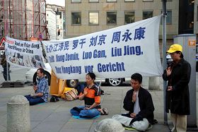 Les pratiquants de Falun Gong ont déployé une banderole où on pouvait lire "Traduisez Jiang Zemin, Luo Gan, Liu Jing et Zhou Yongkang en justice." Ils ont distribué des imprimés et dénoncé le rôle de Zhang Dejiang dans la persécution et le crime du PCC de prélèvement d'organes sur des pratiquants de Falun Gong vivants aux passants, aux employés de la Chambre de commerce et aux journalistes.