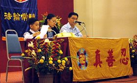 La famille de trois personnes de M. Luo a partagé avec le public comment Dafa a changé sa famille. Plusieurs mois après avoir commencé à pratiquer le Falun Gong, le SGPT qui avait tracassé M. Luo pendant plusieurs années est miraculeusement passé de 146 IU/L à un état normal de 40 IU/L. Mme Luo a parlé de sa cultivation qui se reflète à son travail. Son patron a noté qu'elle était assidue à son travail et un jour, il lui a annoncé une bonne nouvelle : la gestion de la compagnie avait décidé de lui permettre de suivre les cours de maitrise qu'elle désirait suivre et que la compagnie allait payer pour ses cours. Mais elle a refusé l'offre, parce qu'elle a pensé qu'elle devait laisser la chance à d'autres collègues. Le fils du couple, âgé de sept ans, pratique le Falun Gong depuis plus de deux ans et il a également appris que Falun Dafa enseigne aux gens à cultiver l'Authenticité- Bienveillance-Patience. Il a dit qu'il veut en permanence se rappeler l'Authenticité- Bienveillance-Patience.