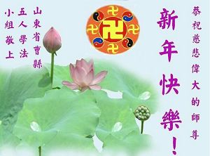 Cinq pratiquants de Falun Dafa qui étudient la Loi en groupe dans le canton de Cao, province du Shandong, souhaitent une bonne année au Maître grandiose et compatissant !