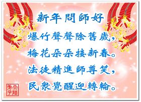 Tous les pratiquants de Falun Dafa à Zaozhuang, province de Shandong, souhaitent à Maître grandiose et compatissant une Bonne Année !