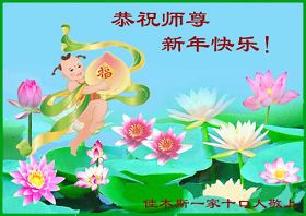 Je travaille maintenant à Changchun, mais je regrette que je n'aie jamais vu le Maître en personne. Bien que j'aie cultivé pendant 12 nouvelle années et je ne devrais pas avoir un tel attachement, tout en marchant sur la rue j'imagine toujours le temps où le Maître a enseigné la Loi dans les premiers temps. En pensant à l'image du Maître, je n’ai pu m’empêcher de pleurer. Bien que le Maître nous ait dit d’abandonner les émotions humaines, je ne peux toujours pas abandonner ma reconnaissance envers le Maître. Seulement en faisant bien les trois choses, en marchant avec droiture sur la dernière étape du chemin de la rectification par la Loi, puis-je me sentir à l’aise. Notre famille entière envoie nos meilleurs vœux au Maître pour une Bonne nouvelle année chinoise.