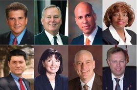 Depuis le coin gauche en haut : Le Gouverneur Jon Corzine ; Le sénateur Robert Menendez ; les membres du Congrès Scott Garrett, Frank Pallone, Bill Pascrell Jr., Donald Payne, Rodney Frelinghuysen et Rush Holt.