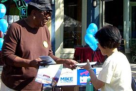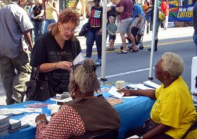 Deloris s’est approchée de la table et elle a dit aux pratiquantes qu’elle avait vu la pratique à New York City, surtout devant le Consulat chinois. Elle a dit que c’est terrible qu’autant de personnes innocentes soient tuées (par le Parti communiste chinois). La pratiquante lui a dit au sujet du site d’enseignement gratuit à Brooklyn. Deloris a pris un dépliant et est partie joyeuse.