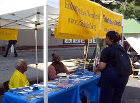 Les pratiquants du Falun Gong de Brooklyn participent à la foire depuis 2000. Ce jour-là, le stand du Falun Gong était joliment décoré. Sur le dessus de la tente, il y avait une banderole dorée avec l’inscription : «Falun Dafa est bon» en lettres bleues, ce qui était très accrocheur. Les visiteurs pouvaient facilement localiser le stand du Falun Gong. Quelques pratiquants ont présenté les exercices et d’autres ont parlé aux passants, en leur présentant le Falun Gong.