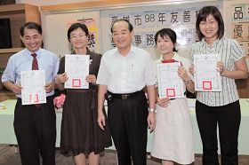 Le Président Ye Hong-tian (premier à partir de la gauche), le Directeur Chang Su-hsing (deuxième à partir de la gauche) et deux professeurs de l'Ecole supérieure de Wufu se sont vus attribuer la récompense de "Meilleure éducation morale" par le Bureau de l'Éducation Bureau |
