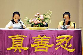 Des jeunes pratiquantes de l’école Minghui ont récité Lunyu ensemble, et deux jeunes pratiquants qui sont membres de la fanfare de la Terre divine ont partagé comment ils ont beaucoup pratiqué pour jouer de leurs instruments de musique avec diligence et ont voyagé à l’étranger pour prendre part aux défilés afin de promouvoir le Falun Gong et offrir le salut aux êtres.