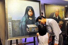 Afin d’aider les gens à se renseigner sur le Falun Gong, l’exposition artistique de Authenticité – Compassion – Tolérance a eu lieu simultanément dans les entrées des premier et deuxième étages du lieu de conférence. Beaucoup de personnes se sont arrêtées pour voir les peintures puissantes créées par les pratiquants du Falun Gong.