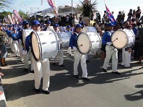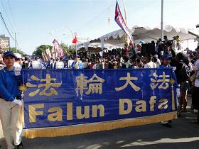 A 15 heures, le contingent du Falun Dafa derrière une immense banderole portant les mots "Falun Dafa" a démarré. Les membres de la Fanfare Tian Guo en superbe costumes bleus et blancs marchaient synchrones et rayonnants. La performance de l'orchestre a reçu de chaleureux applaudissements des personnalités sur le podium et des milliers de spectateurs amassés tout du long des sept kilomètres de trajet du défilé.