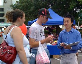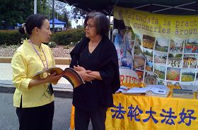 À côté du stand des pratiquants, il y a avait un couple de chinois qui vendaient des produits chinois. Le mari venait d’arriver en Australie en provenance de la Chine, et la femme est ici depuis un moment, donc elle en savait un peu à propos du Falun Gong. La femme a demandé aux pratiquants ; « Je vous vois souvent diffuser de l’information. J’ai pris connaissance de la persécution. Je me demande s’il y a une organisation qui vous fournit vos documents.» Les pratiquants lui ont dit qu’ils payaient eux-mêmes avec leur propre argent toutes les brochures, dépliants et autres documents. Le mari pensait que les pratiquants étaient impliqués dans la politique. Les pratiquants lui ont dit les faits derrière la propagande mensongère du Parti. En fin de compte, il a convenu avec les pratiquants et a accepté une copie des Neuf commentaires sur le parti ainsi que d’autres documents.