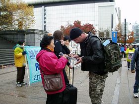 Les pratiquants de Falun Gong tenaient des bannières où ont pouvait lire « SVP aidez-nous à secourir nos parents » et « Arrêtez la persécution de Falun Gong. » Ils ont aussi montré des photos dépeignant les tortures utilisées pour abuser des pratiquants dans les lieux de détention en Chine. Plusieurs personnes étaient touchées et plusieurs sont venus pour signer la pétition aussitôt qu’ils ont vu que c’était un évènement de Falun Gong.