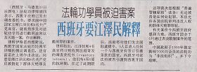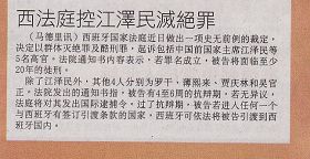 Le Guang Ming Daily rapportait qu'un juge espagnol a inculpé cinq hauts fonctionnaires du Parti communiste chinois (PCC) pour leur rôle dans les crimes de torture et de génocide commis contre les pratiquants de Falun Gong Suite à deux ans d'enquête, Ismael Moreno, juge à la Cour nationale d'Espagne a averti la semaine dernière l'avocat Carlos Iglesias de la Human Rights Law Foundation (HRLF) que la cour avait accepté une demande d'envoyer des lettres rogatoires (lettres de requête) aux cinq accusés en Chine, avec des questions relatives à l'implication de chaque individu dans la persécution du Falun Gong.