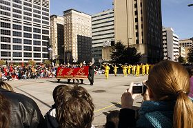 Le défilé du Falun Gong commençait avec des banderoles sur lesquelles on pouvait lire, « Falun Dafa » et « Authenticité-Compassion-Tolérance » en anglais et en chinois. Les musiciens de la Fanfare de la terre divine portaient des costumes de la dynastie des Song et ont joué des chansons telles que « Falun Dafa est bon », « Tambours et trompettes ébranlent les dix directions », et « America the Beautiful ». La fanfare est composée de pratiquants de Falun Gong de Houston, Dallas et Austin. L'équipe de présentation des exercices portait des costumes jaunes et a montré les exercices. De nombreux spectateurs ont chaleureusement applaudi et ont pris des photos.