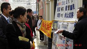 Les pratiquants de Falun Gong en ont appelé Hu Jintao a mettre fin à la persécution et à amener les principaux coupables, Jiang Zemin et son gang, devant la justice. On pouvait lire sur leurs banderoles "Falun Dafa Hao" (Falun Dafa est bon) et "Dissoudre le Parti communiste et arrêter la persécution." De nombreux touristes chinois ont vu les banderoles, pris des photos et accepté les matériaux d'information des mains des pratiquants.