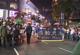 Le défilé a commencé à 21h00, la Fanfare de la Terre divine avançait tout en jouant «Falun Dafa est bon.» Après que la fanfare soit passée devant la tribune des invités, des milliers de spectateurs qui étaient le long des deux côtés de la rue, l’ont applaudie et acclamée. La Fanfare de la Terre divine a également joué «Tambours et trompettes de la Loi ébranlent le monde des dix directions», «L’Hymne à la Joie» et «Joy to the world »et d’autres pièces.