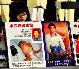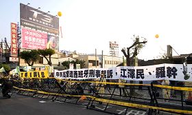 Depuis le 20 décembre, les pratiquants de Falun Gong ont tenu des banderoles : « Falun Dafa est bon, » « Les fonctionnaires à niveau élevé du PCC, Jiang Zemin, Luo Gan, Boxilai, Jia Qinglin et Wu Guanzheng, ont été accusés par le tribunal espagnol, » et d'autres messages, le long des routes autour du lieu de rendez-vous de conférence où le PCC et les fonctionnaires taïwanais se sont réunis. Les pratiquants ont tenu 350 grandes banderoles, déployées en ligne sur plusieurs kilomètres. La protestation « avec le sit-in » et l'affichage des banderoles pacifiques ont continué de 4 h du matin jusqu'à minuit.