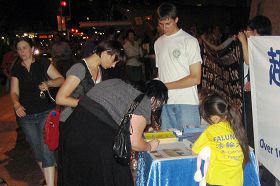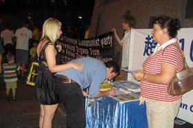 Un autre homme a joint les mains devant sa poitrine devant une photo d'un pratiquant qui avait été torturé à mort en Chine. Puis il s'est assis quelques minutes avec les pratiquants. Beaucoup de gens ont accepté les dépliants et signé la pétition pour soutenir le Falun Gong