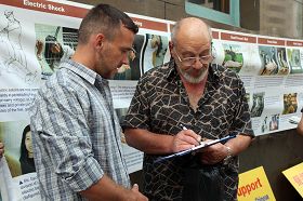 Ross (à droite) un bénévole du bureau des démissions, distribue des documents d’information.