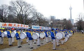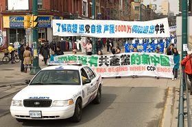 Des centaines de citoyens de Toronto se sont réunis au Parc Grange près du Chinatown à midi le 8 mars 2009, pour organiser un rassemblement et une marche en soutien des 50 millions de chinois qui ont renoncé au PCC et à ses organisations affiliées. Ils ont également encouragé les chinois à apprendre les faits et à se sauver en renonçant au PCC avant sa désintégration. L’activité a démarré avec une prestation de la fanfare de la Terre divine.