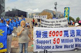 Beaucoup de gens étaient dehors cet après midi là, encouragés par un temps particulièrement doux. Des représentants du Centre d'aide aux démissions du PCC, le journal Epoch Times, la CIPFG et l'Association Falun Dafa de la province de Victoria, ainsi que l'ancienne championne olympique Mme Jan Becker et une pratiquante de Falun Dafa de Chine continentale ont pris la parole au rassemblement. La Fanfare Tian Guo [Ndt : pays céleste] a joué et attiré beaucoup de monde.