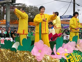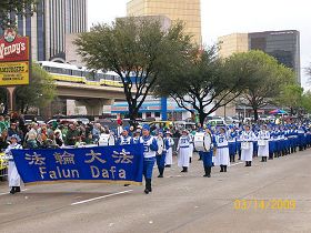 Dans la matinée du 14 mars 2009, le 30e défilé de la St-Patrick à Dallas a descendu l’avenue Greenville. Le défilé était composé de plus de 150 groupes attirant des dizaines de milliers de spectateurs. En tant que seul contingent asiatique, les pratiquants du Falun Dafa du Texas étaient représentés par la fanfare de la Terre divine et un char allégorique décoré. La musique résonnante, le magnifique char et la présentation des exercices impressionnants ont apporté aux spectateurs une expérience rafraîchissante et paisible, auxquels ils ont répondu avec des applaudissements enthousiastes.