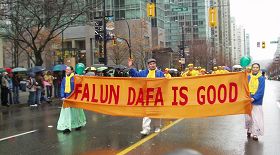 Le 15 mars, le groupe de tambourins à ceinture du Falun Gong composé de 15 pratiquants de Vancouver, Canada, a effectué une prestation lors du défilé annuel de la St-Patrick. Leurs prestations ont été chaudement accueillies par les spectateurs.