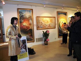 L’artiste Mme Chou I-hsiu a expliqué la signification des oeuvres d’art aux visiteurs. Elle a insisté sur le fait que bien que les œuvres montrent des scènes cruelles de persécution, elles inspirent la compassion et la condamnation des crimes. Elle a indiqué qu’il s’agissait d’une façon très positive d’exposer la persécution qui se déroule en Chine.